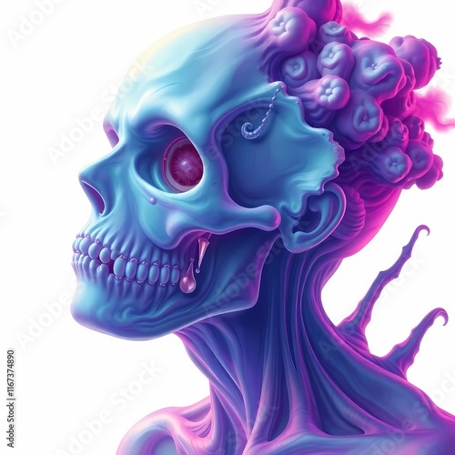 Spectral Skull: A surreal and haunting image of a skull rendered in vibrant hues of blue and pink, showcasing intricate details and a mesmerizing ethereal glow.