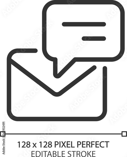 Speech bubble with envelope pixel perfect linear icon. Email notification. Receive new letter. Online communication. Thin line illustration. Contour symbol. Vector outline drawing. Editable stroke