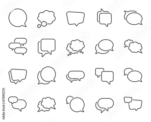 Speech bubbles line icons. Social media message, comic bubbles and chat. Think sticker, Comment speech and talk bubble icons. Discussion balloon, chatting box, cartoon message. Vector