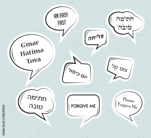 Speech bubbles with traditional greetings for Yom Kippur Jewish holiday. I am sorry, easy fast , in Hebrew