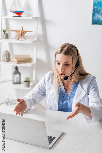 Speech therapist in headset having video call on laptop in consulting room.