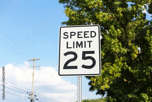 Speed limit road sign with number 25. Traffic regulation symbol on metal pole. Highway safety control sign in city area. Driving law and transportation rules. Outdoor street sign with clear blue sky.