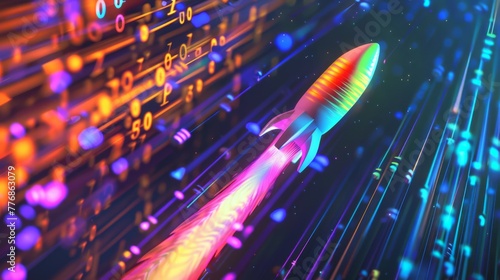 Speed of Innovation. A rocket blazes through vibrant data streams, encapsulating the rapid pace of digital transformation and the agility of businesses in the data-driven world.
