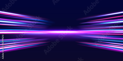 Speed police line. Laser beams, horizontal light rays. Magic shining neon light line trails. Purple glowing wave swirl, impulse cable lines. High speed effect motion blur night lights