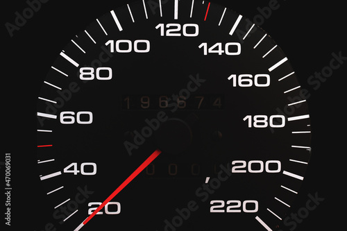 Speedometer in a car. Car dashboard. Dashboard details with indication lamps.Car instrument panel. Dashboard with speedometerCar detailing. Modern interior.Closeup.Copy space.