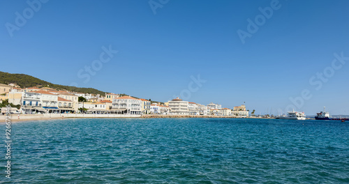 Spetses island, Greece. Seafront buildings view from the sea