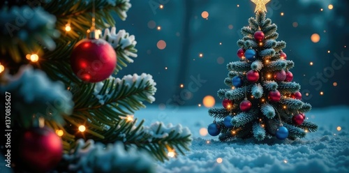 Spheres and stars adorn a frosty evergreen Christmas tree, branches, glittering, stars
