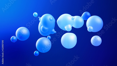 Spheres or balls merge like liquid wax drops or metaballs in-air. Liquid gradient of blue colors on beautiful drops with glow, scattering light inside. 3d render. 17