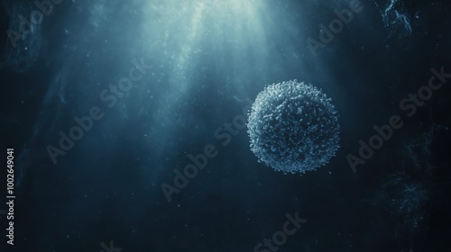 Spherical object resembling a virus or a cell, highlighted by a central light source, set against a dark, underwater-like background with scattered particles
