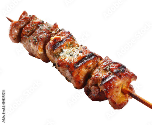 Spiced grilled meat kebabs on skewers for summer BBQs on a transparent background, cut out