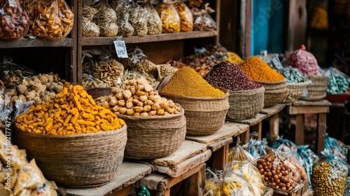 Spices and grains in woven baskets displayed at vibrant outdoor market