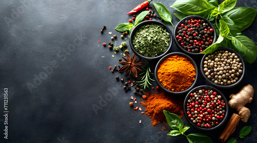 Spices and herbs on dark textured background, Different seasonings in cups, Food and cuisine ingredients wide banner, Flat lay, top view, food design, with copy space.