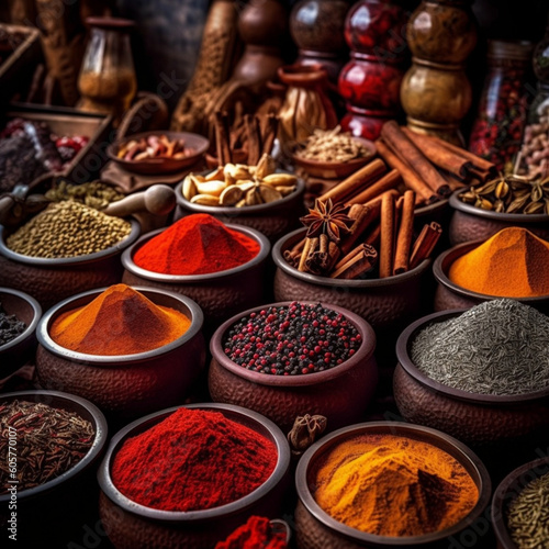 spices in the market landscape with mountains created by Generative AI