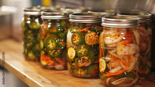 Spicy Kimchi, fermented jalapenos, pickled pepperoncini in glass jar