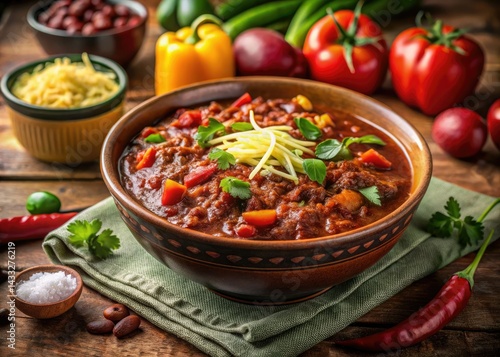 Spicy Beef Chili Bowl Recipe - Ground Beef, Beans, Tomatoes, Cheese - Delicious Food Photography