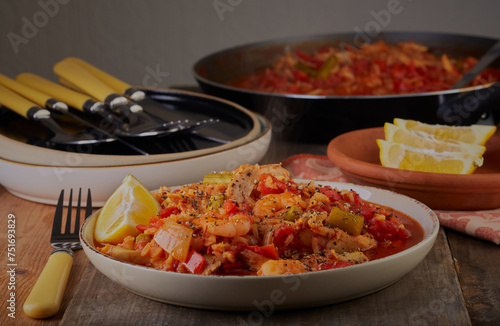 Spicy chicken and prawns in a rich sauce garnished with a lemon slice.