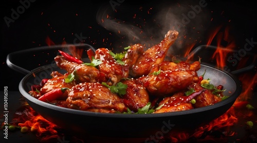 Spicy chicken wings mid toss in a wok with vibrant red sauce droplets and smoke curling up creating a mouthwatering and dynamic culinary scene