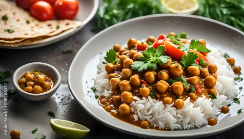 Spicy chickpeas curry with rice, tomato and Poppadoms in white plate. Healthy tasty vegetarian food