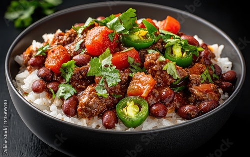 Spicy chili con carne stew with beans and ground beef served over a bed of white rice in a dark bowl. Garnished with chopped tomatoes, jalapenos, and cilantro