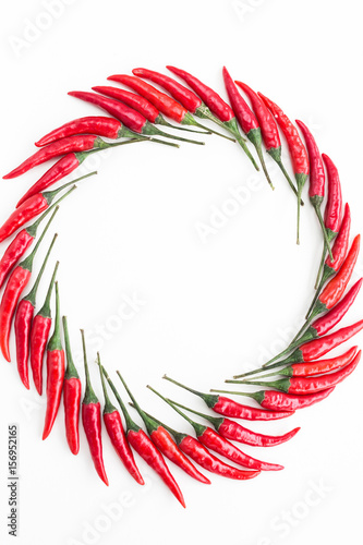 spicy food, popular spices concept - decorative pattern of circle from hot chili peppers on white background, hot figure of lying pepper, top view, flat lay, free space for text, vertical