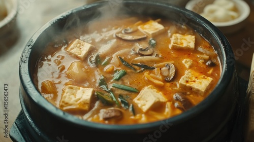 Spicy Korean Tofu Stew with Vegetables in Traditional Pot