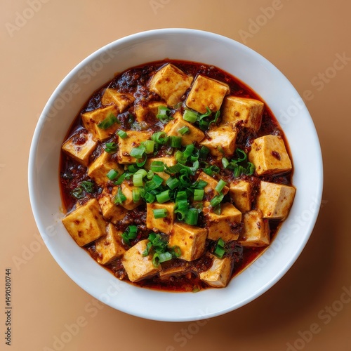 Spicy Mapo Tofu Dish with Green Onion and Chili Oil in White Bowl