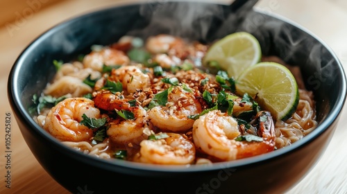 Spicy Prawn Noodles with Lime Wedges and Fresh Herbs