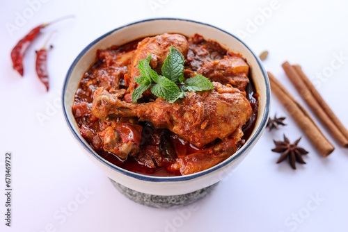 Spicy red chicken curry. Goan style chicken vindaloo. Butter chicken Murgh Makhani curry roast hot and spicy gravy dish Dhaba Punjab, India. North Indian non-vegetarian cuisine Garam Masala. tikka