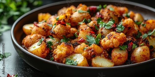 Spicy roasted vegetables with herbs and spices in a dark bowl.