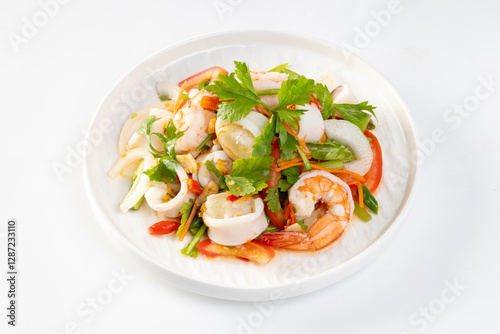 Spicy seafood salad, Thai spicy food recipe, Yum Spicy seafood on a white background
