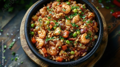 Spicy shrimp and rice bowl with vegetables, garnished with herbs.