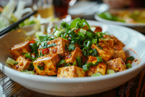 Spicy Tofu Dish Garnished with Fresh Green Onions on White Plate