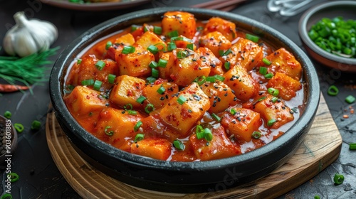 Spicy Tofu with Green Onions and Sesame Seeds in a Black Bowl