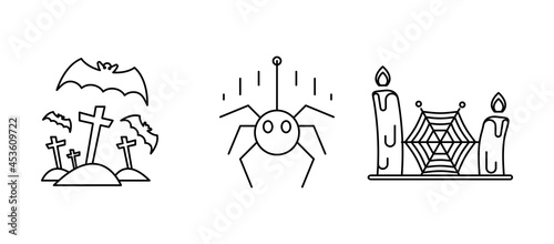 Spider, candle and bat icons hanging in the air. Set for Halloween concept. It is a set of linear icons.