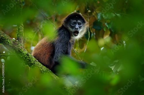Spider monkey on palm tree. Green wildlife of Costa Rica. Black-handed Spider Monkey sitting on the tree branch in the dark tropical forest. Animal in the nature habitat, on the tree.