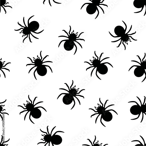 Spider pattern seamless. Black spiders on white background endless vector wallpaper. Spider silhouette endless pattern for fabric, textile or paper ornament. Halloween decoration background texture.