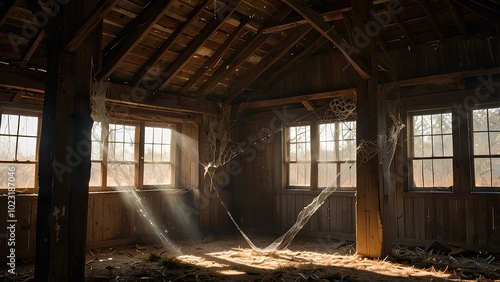 Spider Webs in an Abandoned Barn: Dusty Light Beams Enhance the Spooky Atmosphere