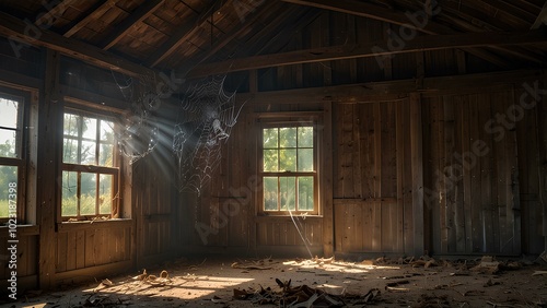 Spider Webs in an Abandoned Barn: Dusty Light Beams Enhance the Spooky Atmosphere