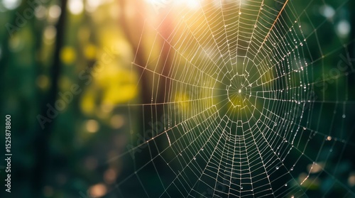 Spiderweb glistening with dewdrops suspended against a blurry green forest backdrop