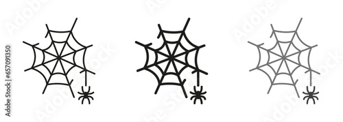 Spiderweb Line and Silhouette Icon Set. Spooky Spider Web, Halloween Decoration Pictogram. Fear Cobweb Trap with Spider on Thread Symbol Collection. Isolated Vector Illustration