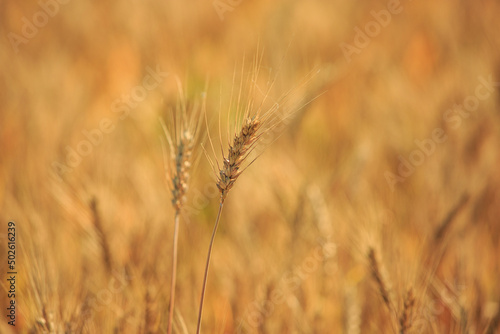 Spike of rye in the field, ripe spike of rye in the field on a sunny day. Agricultural production.