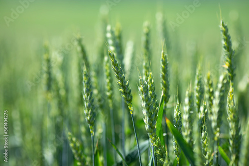 Spikelets of young wheat on a green farm field. Preparation for harvest