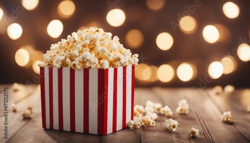 Spilled popcorn and paper bucket in red strip box, isolated background