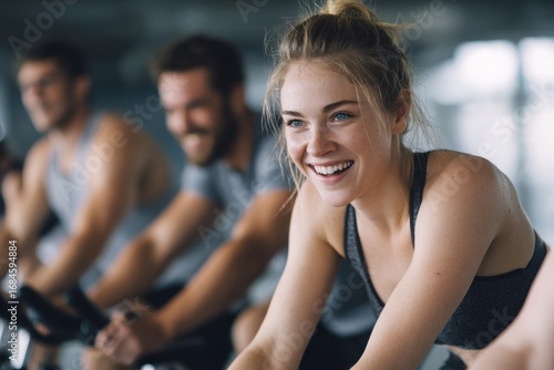 Spin Cycle Class. Female Athletes Exercising on Stationary Bikes in Modern Gym