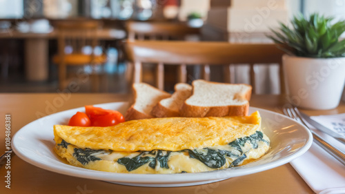 Spinach omelette served with toast and hash browns. Food photography in a restaurant diner setting with breakfast food.