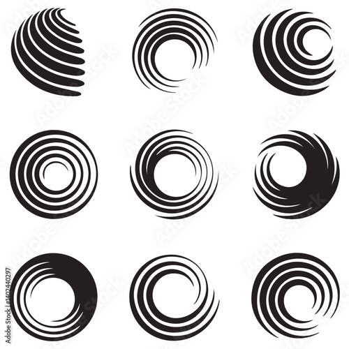 Spiral and swirl motion twisting circles design element set Vector Black silhouettes. with white background