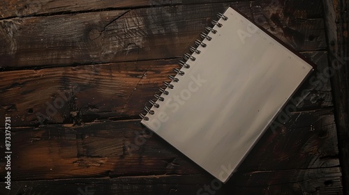Spiral bound notebook on aged wooden table with blank page and dim lighting