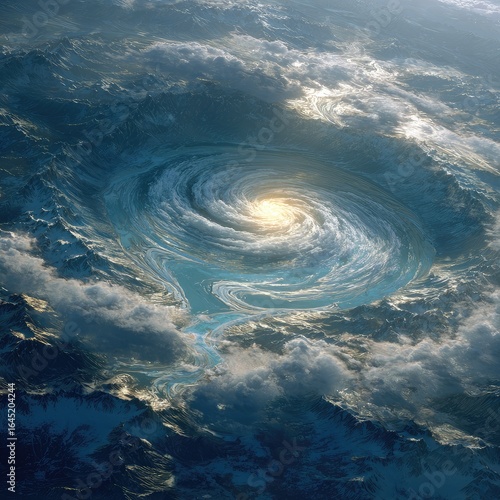 Spiral vortex in a cloudy, mountainous landscape