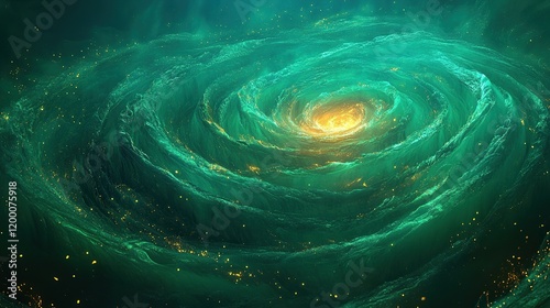 Spiraling layers of glowing mist softly swirling around a radiant glowing core in deep emerald green and vibrant cyan highlights