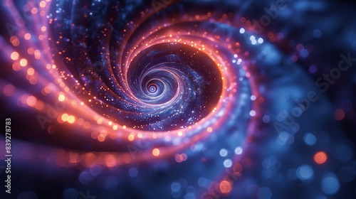 Spiraling neon lights and spotlights in an abstract backdrop.
